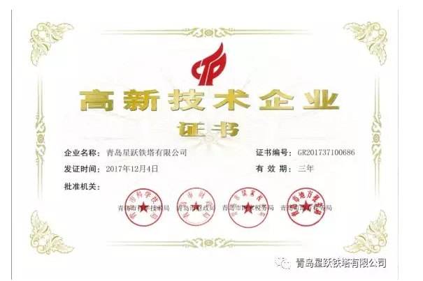 青島星躍鐵塔有限公司于近日收到由青島市科學(xué)技術(shù)局、青島市財(cái)政局、青島市國(guó)家稅務(wù)局、青島市地方稅務(wù)局聯(lián)合頒發(fā)的《高新技術(shù)企業(yè)證書》,相關(guān)信息如下: